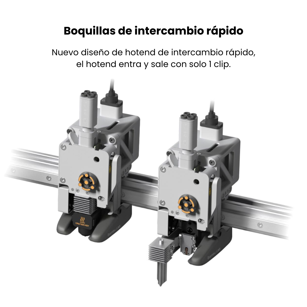 Extrusora / Hotend Engranajes de acero endurecido · Hotend all-metal · Boquilla 0,4 mm (0,2/0,6/0,8 opc.) · Cambio rápido